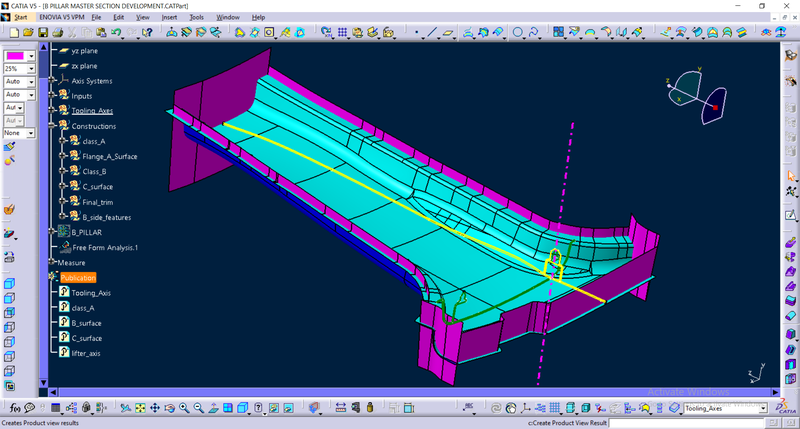 The project report deals with the steps and procedures followed while creating a plastic interior B pillar trim for cars designed using CATIA V5 surface workbench. It explains the method I followed for creating the main tooling axis, side core axis, Class B surface, Class C surface and final closed body creations. It also explains the draft analysis performed to check the manufacturability of the product using injection moulding.