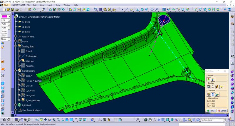 Here, there was a small patch of blue which represents area with draft angle less than three degree. So in order to rectify that we have to contact the styling team whom designed the class A surface. A draft analysis report was sent to styling team for that purpose.