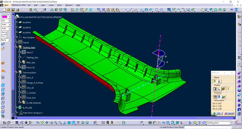 Thus, following the guidelines, a dog house required for B pillar was designed using CATIA V5 Surface workbench as shown in the images. Thickness was applied to the surface using part design workbench. Necessary draft angle and fillets were also applied on it. A 4 way locator was also designed above the Dog -house according to the master section. Then one more doghouse was placed opposite to it with a minimum distance of three times the side wall width of doghouse. Otherwise the lifter for moulding the doghouse inner walls can’t be moved along lifter axis. Draft analysis was successfully performed with 0.5 degree draft angle. Four way locators will be cleared along the main tooling direction.