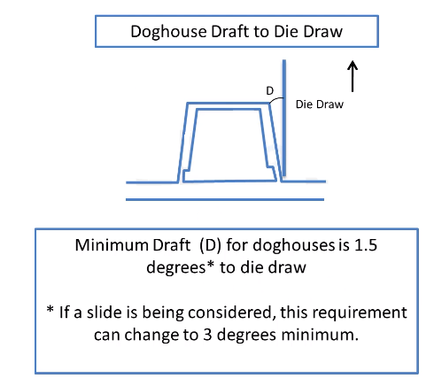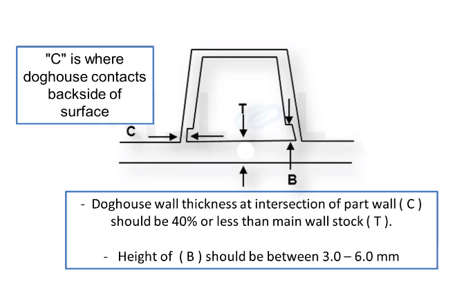 Dog house is an engineering feature used in plastic trim design. The primary function of a dog house is to avoid sink marks on the class A surface which may occur due to features such as a thick screw boss or rib on the back side of Class A. So the best possible solution is to increase the height and decrease the cross sectional thickness of the ‘legs’ by using a dog house. We can also use them for solving necessity of large length features such as a screw boss which may requires large length sometimes. We can use a dog house and make a screw boss above it on such situations. We can also use them for making features which are perpendicular to the main tooling direction.