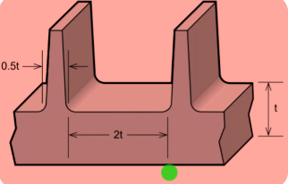 between ribs for adequate mould cooling: for short ribs allow at least two times the wall thickness.